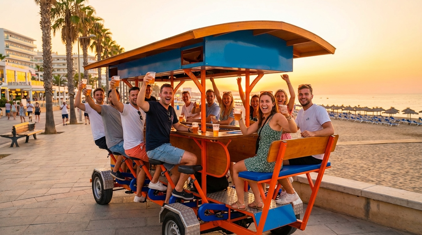 El Pack Low Cost es para grupos que quieren un plan sencillo, sin actividades caras y sin perder la parte buena: cenar y salir. Arrancamos con bicibirra (una hora de paseo con bebida), que va genial para calentar ambiente y hacer fotos por el paseo marítimo.